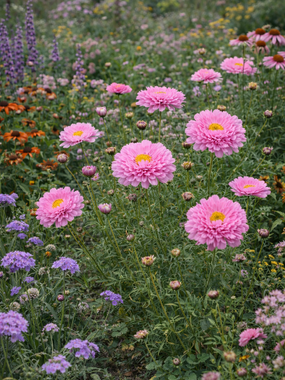 Įspūdingais, pusiau pilnaviduriais, šviesiai rožinės spalvos žiedais. Idealiai tinka sodinti spalvinguose vienmečių gėlių gėlynuose, skynimui. Aukštis iki 120cm